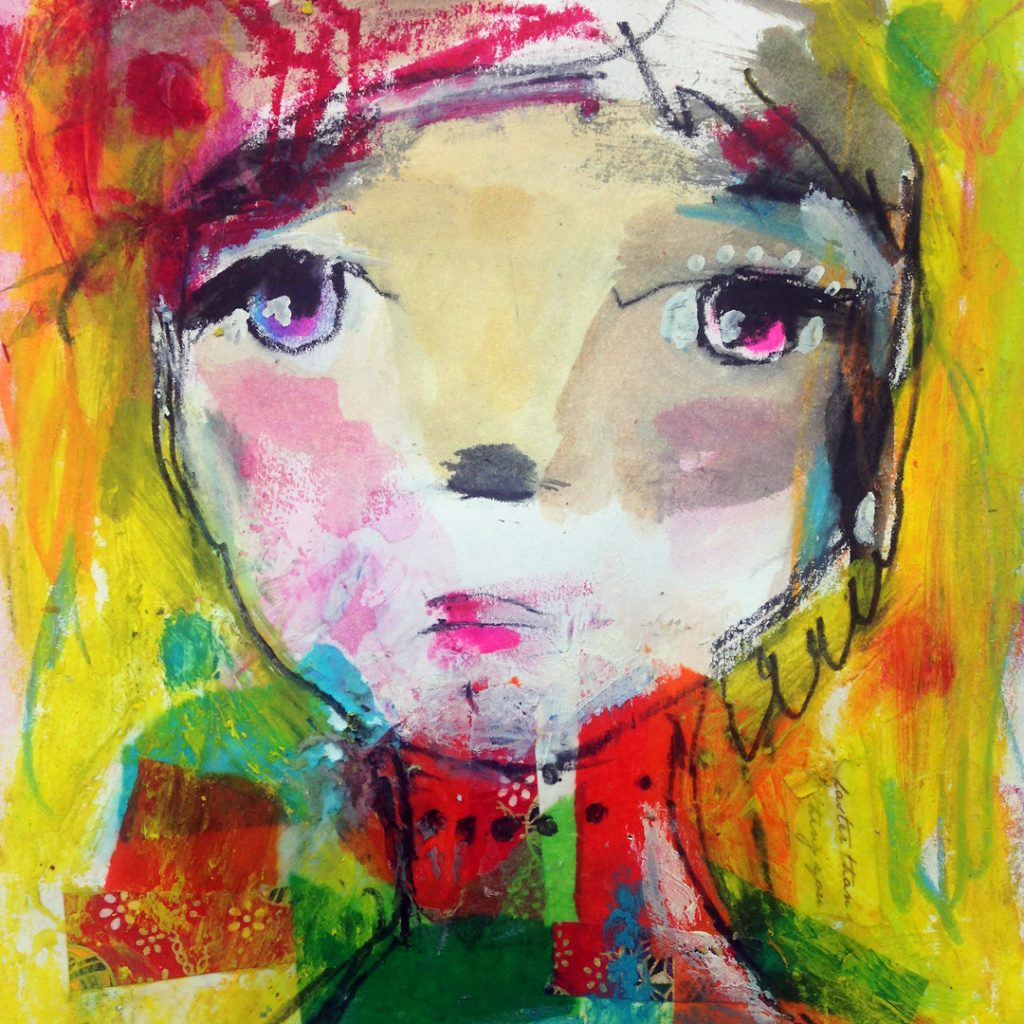 *The one thing I DO pay attention to, as I glue down collage materials, I try and keep in mind where my eyes will be and avoid adhering papers in those areas (it’s much harder to cover up and can mean a paper crease where I don’t really want one).