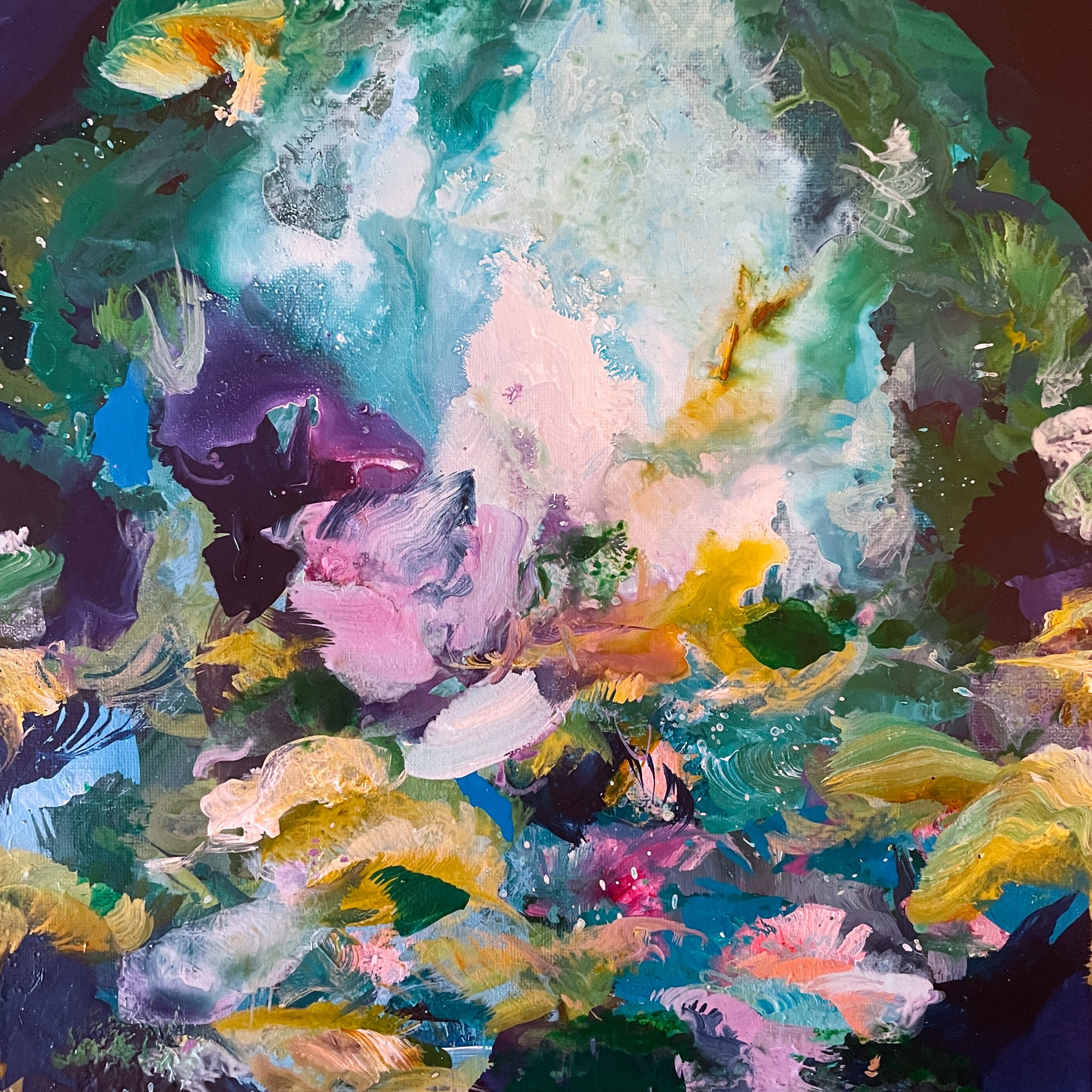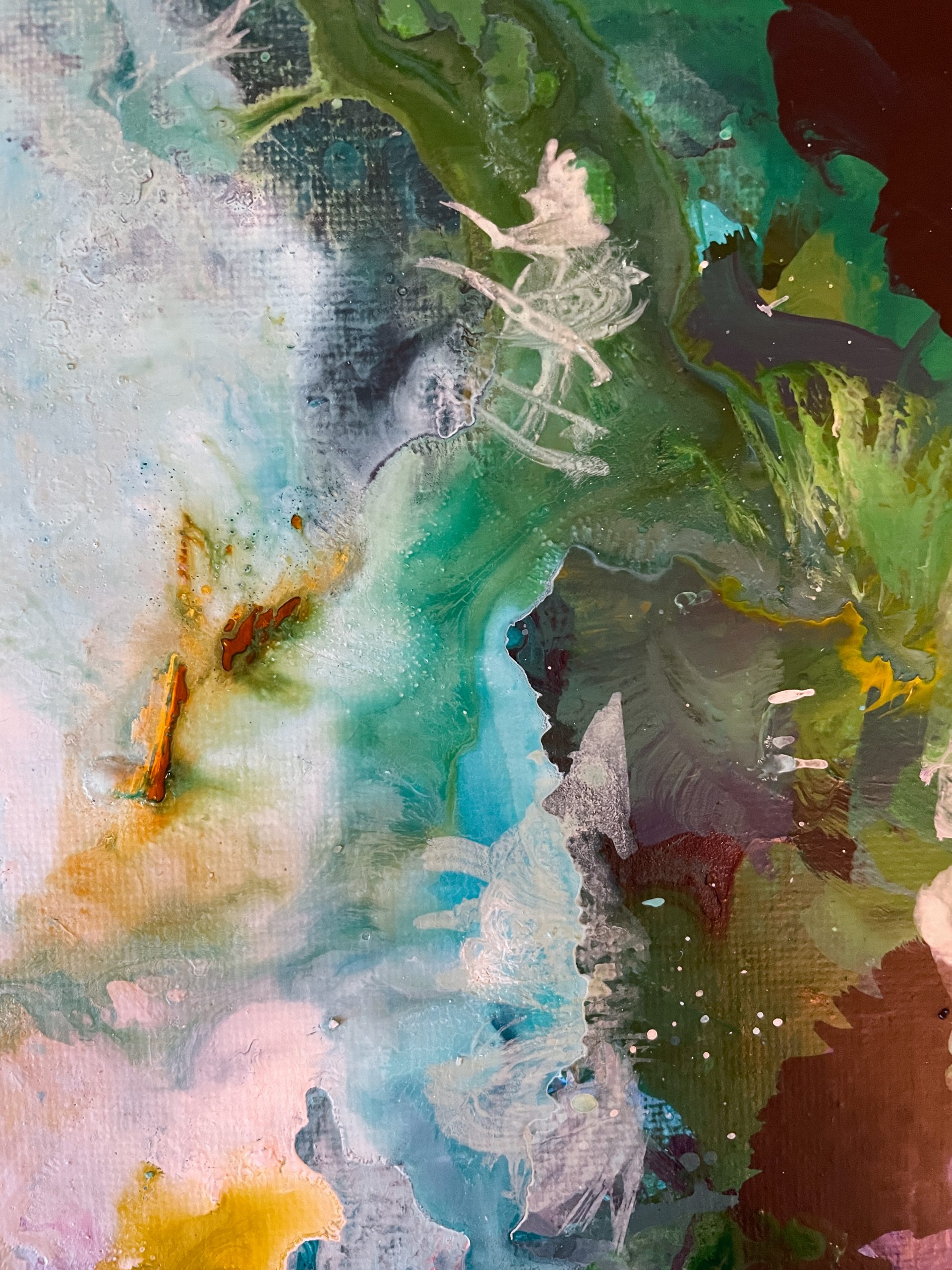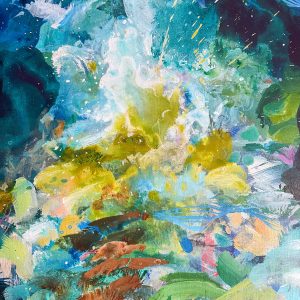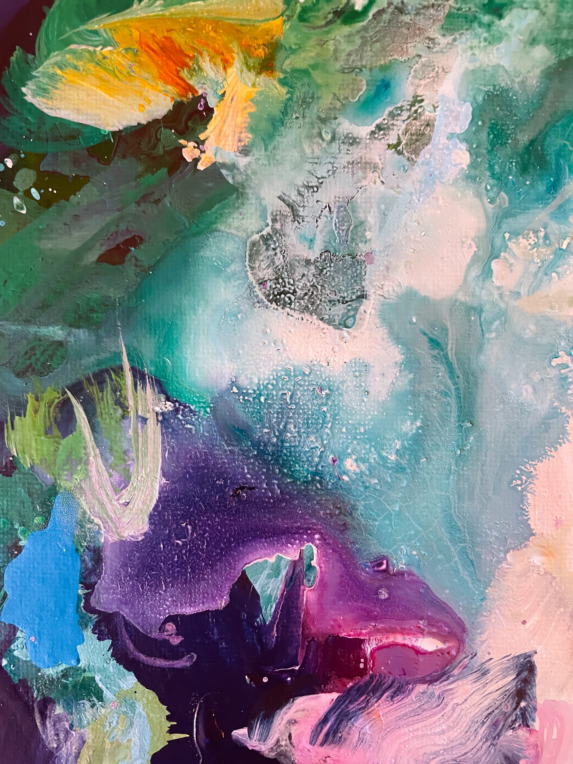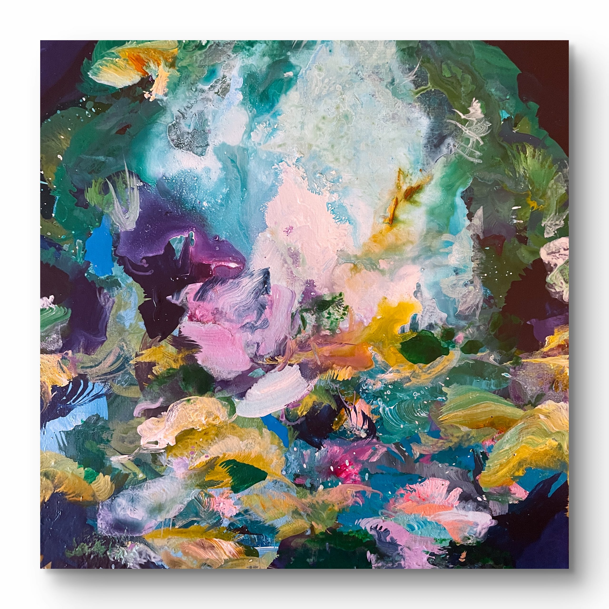 This is an original 12″ x 12″ mixed media painting on cradled birch by artist, Juliette Crane.